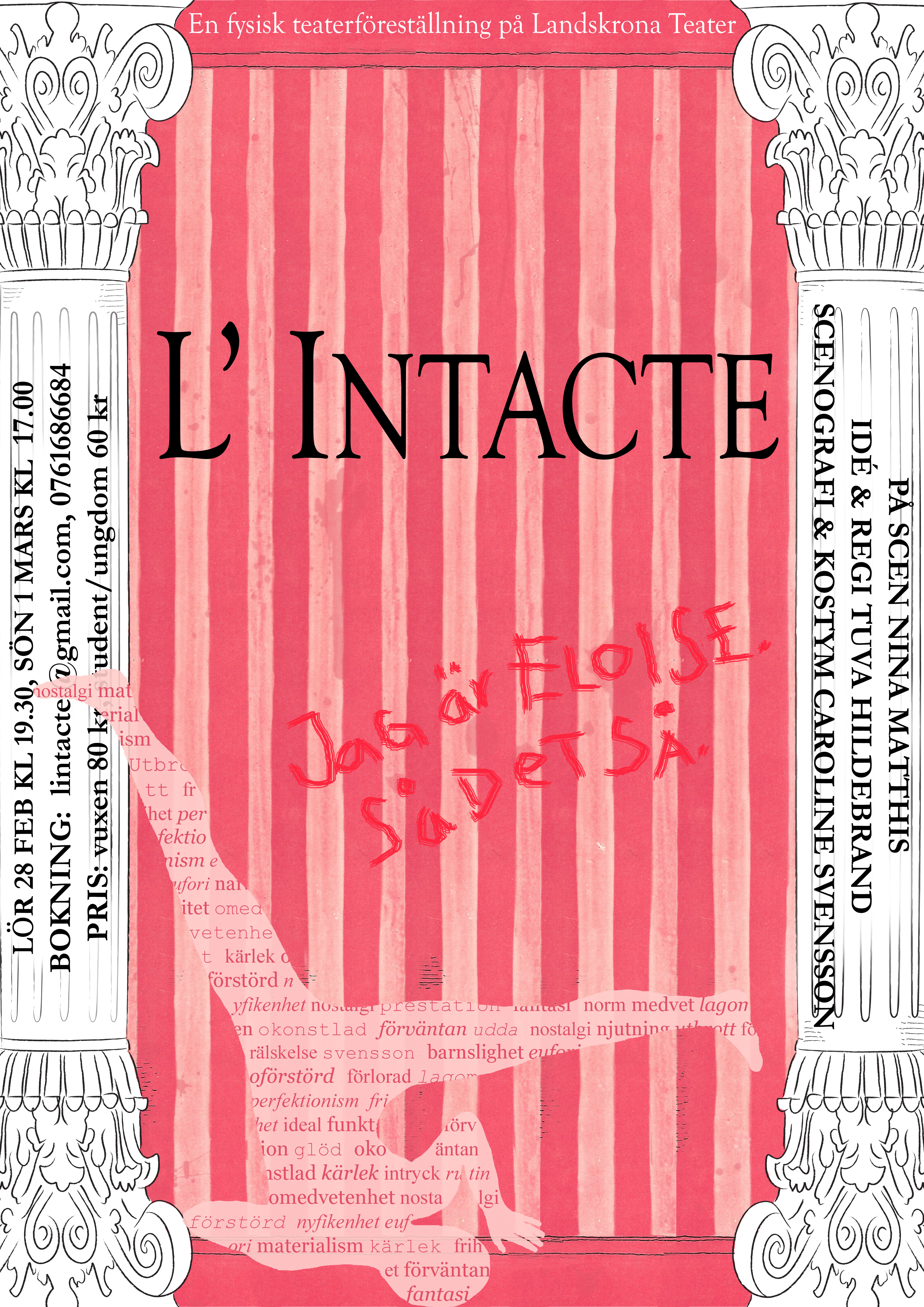 L’Intacte was written by Tuva Hildebrand in the autumn of 2008, by combining the children story of Eloise by Kay Thompson and Tuva’s own written prose, into a piece about the conditioned strive for happiness. It premiered in March 2009 at Landskrona Teater in Sweden after receiving a grant from Landskrona City. In December 2009 L’ Intacte was brought to Dusko Radovic Theatre in Belgrade, where it was remade to an English version.
