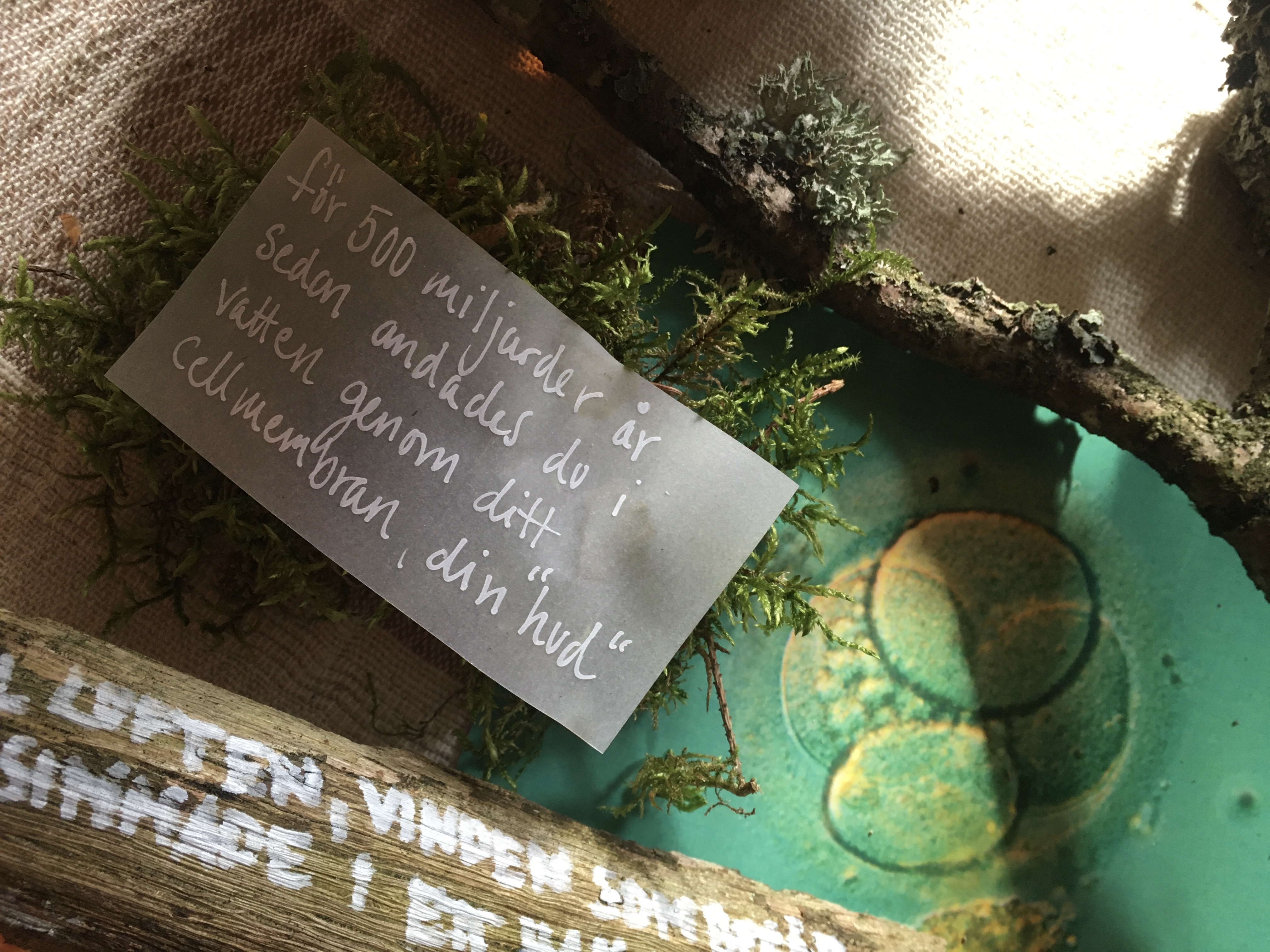 Dear Earthling is an interactive one-to-one performance guiding one person at a time through a ritual which brings us close to nature’s cycles of life, death and transformation. It explores our relation to the more-than-human and questions our anthropocentric world-view. Inspired by humans evolutionary and embryological journey the ritual leads the audience through a room of their lungs, ocean and birth, a room of their heart, wood and movement, and lastly their skeleton, soil and death. During a little less than an hour the audience are invited to listen, smell, move, write, touch and be touched.