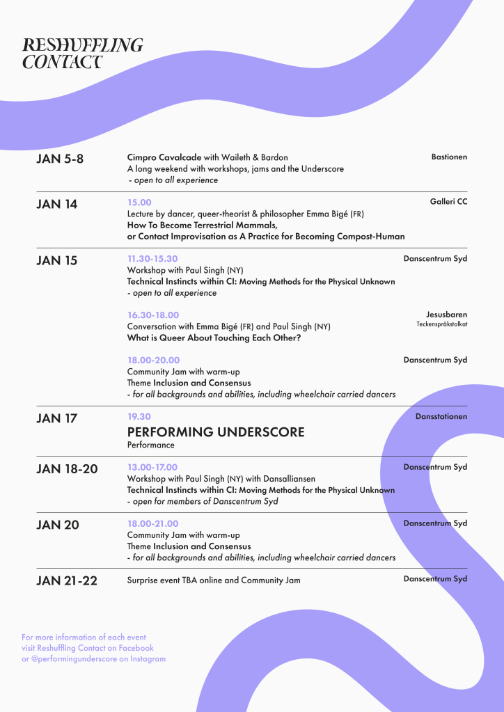 2023 | reshuffling contact festival | artistic director & organizer A dance festival taking place in Malmo, Sweden, in January 2023. Made possible through collaborations with Dansstationen, Galleri CC, Danscentrum Syd, Jesusbaren and support by Region Skåne and Kulturrådet. Related